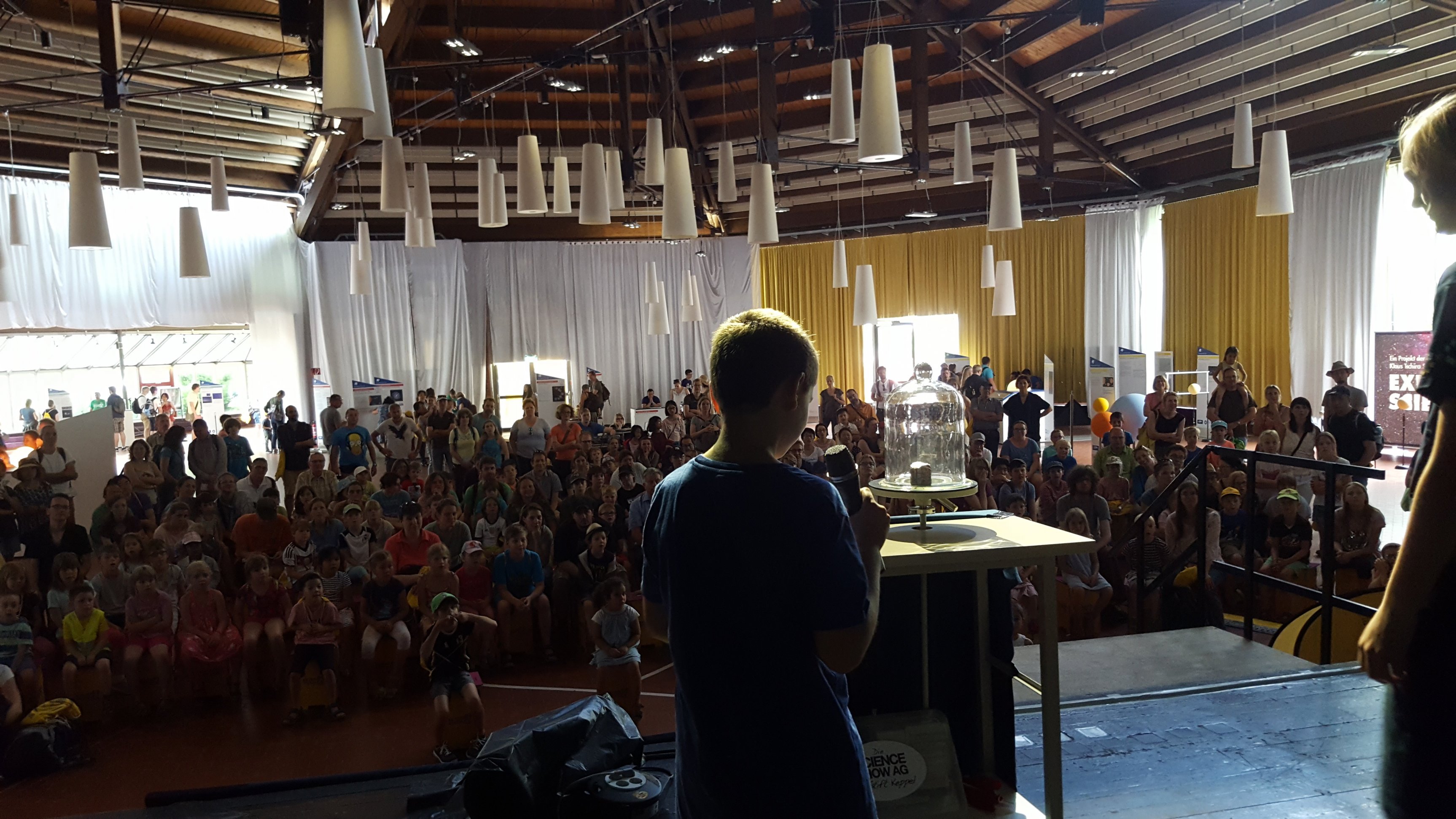So machte sich am Freitag eine elfköpfige Gruppe, inklusive Frau Röder und Herrn Diehl als betreuende Lehrer, auf, um in Mannheim eine ganz neue Show zu präsentieren. Das diesjährige Thema der Messe war Astronomie – für die AG ein Thema, zu dem es zu Beginn der Vorbereitungsphase galt, sich zum ersten Mal Experimente zu überlegen. Ganz neue Experimente waren so zum Beispiel das Versetzen eines Schaumkusses in ein Vakuum und das Zeigen der Gravitation anhand einer um eine andere kreisende Kugel. Und so waren alle gespannt, wie wohl die Shows laufen würden. Nach einer letzten Probe auf der Mannheimer Bühne nach der Ankunft am Freitagabend legte sich das große Lampenfieber aber ein wenig und es wurden beim Grillabend erstmal die hungrigen Wissenschaftlerbäuche gestärkt. Der Samstag als erster Auftrittstag startete mit einem Schauspiel-Warm-Up und letzten Bühnenvorbereitungen. Pünktlich zur ersten Show erhielten wir Besuch aus der Heimat – Herr Zeigan kam, um sich unsere Premierenshow anzusehen. Nach zwei tollen Shows konnten wir uns noch eine Lehrer-Physik-Show-Gruppe ansehen und anschließend verbrachten wir den Nachmittag mit gemeinsamen Ballspielen und Erkunden des Messegeländes im Luisenpark. Der Abend ging mit leckerem Pizzaessen zu Ende. Schon am nächsten Morgen standen die beiden Shows an und nachdem auch die erfolgreich liefen, konnten wir stolz und zufrieden die von den Shows übrig gebliebenen Schaumküsse essen. Dann hieß es auch schon wieder einpacken und nach Hause fahren, damit wir auch pünktlich zum ersten WM-Spiel der deutschen Nationalmannschaft wieder im heimischen Siegerland sein konnten.