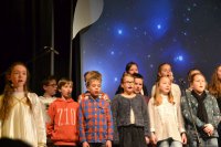 Die chorischen Beiträge der Jüngeren wurden von den Musikklassen 5m, 6m und 7m gestaltet. Sie boten unter der Leitung von Christina Kolberg-Böhm und Valerie Barth vor weihnachtlichem Bühnenbild (gestaltet von der Kunstlehrerin Angela Deimel) das kleine Singspiel „Großer Stern, was nun?“ von Peter Schindler dar, in dem Johanna Kiess und Maike Müller als sichere Solistinnen glänzten. Eine beachtliche Probe ihres wöchentlichen Übens zeigten die Musikklassen unter der Leitung von Kantorin Andrea Stötzel mit „Sing Jubilate“ und „Born this Day“. Die Früchte der gründlichen Stimmbildungsarbeit waren deutlich zu vernehmen. Und auch der Chor der älteren Schüler (Differenzierungskurs Musik Jgst. 8 und Vokalpraktischer Kurs Jgst. Q1) bereichterte das Programm mit einem a-capella gesungenen eindrucksvollen Friedenslied, „In the Town of Bethlehem“ und „Have a Merry One“.