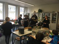 Im Physikraum drängten sich die begeisterten Besucher an den Experimentiertischen, gleichzeitig präsentierten sich aber auch die Fachbereiche, verschiedene kreative Projekte, die SV und der Förderverein. Die Grundschulkinder durften das erste Mal am Schnupperunterricht teilnehmen, während die Eltern von Lehrkräften durch die Schule  begleitet wurden.